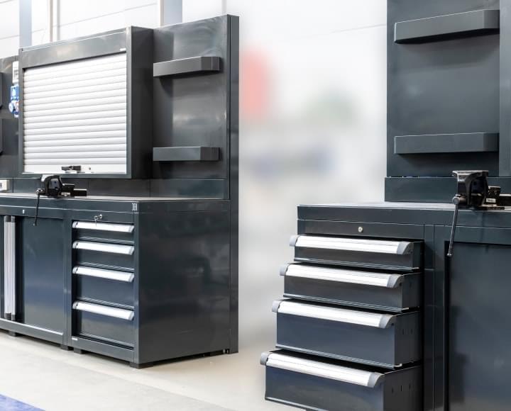 - Industrie-Schränke. Mit Lochwänden zum Aufhängen der Werkzeuge, und mit Türen oder Rolladen (manuell oder motorisiert) verschlossen.