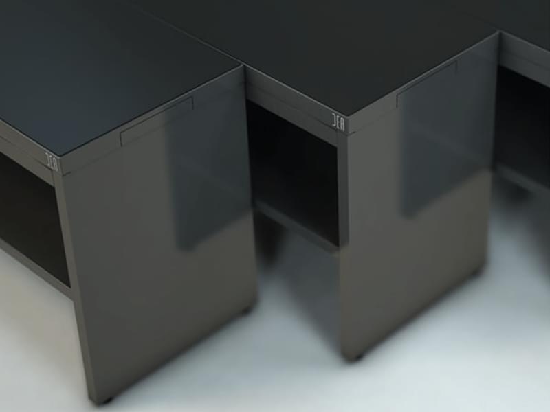 Zur Auswahl stehen Einzel-, Zwei- und Dreifachmodule in 2 verschiedenen Höhen (92 cm oder 110 cm), die einzeln verwendet oder zur gewünschten Arbeitsfläche kombiniert werden können. Die Ablage auf halber Höhe weist eine ABS Beschichtung auf, die hart aber leicht und vor allem resistent gegen aggressive Mittel ist und nicht verkratzt.