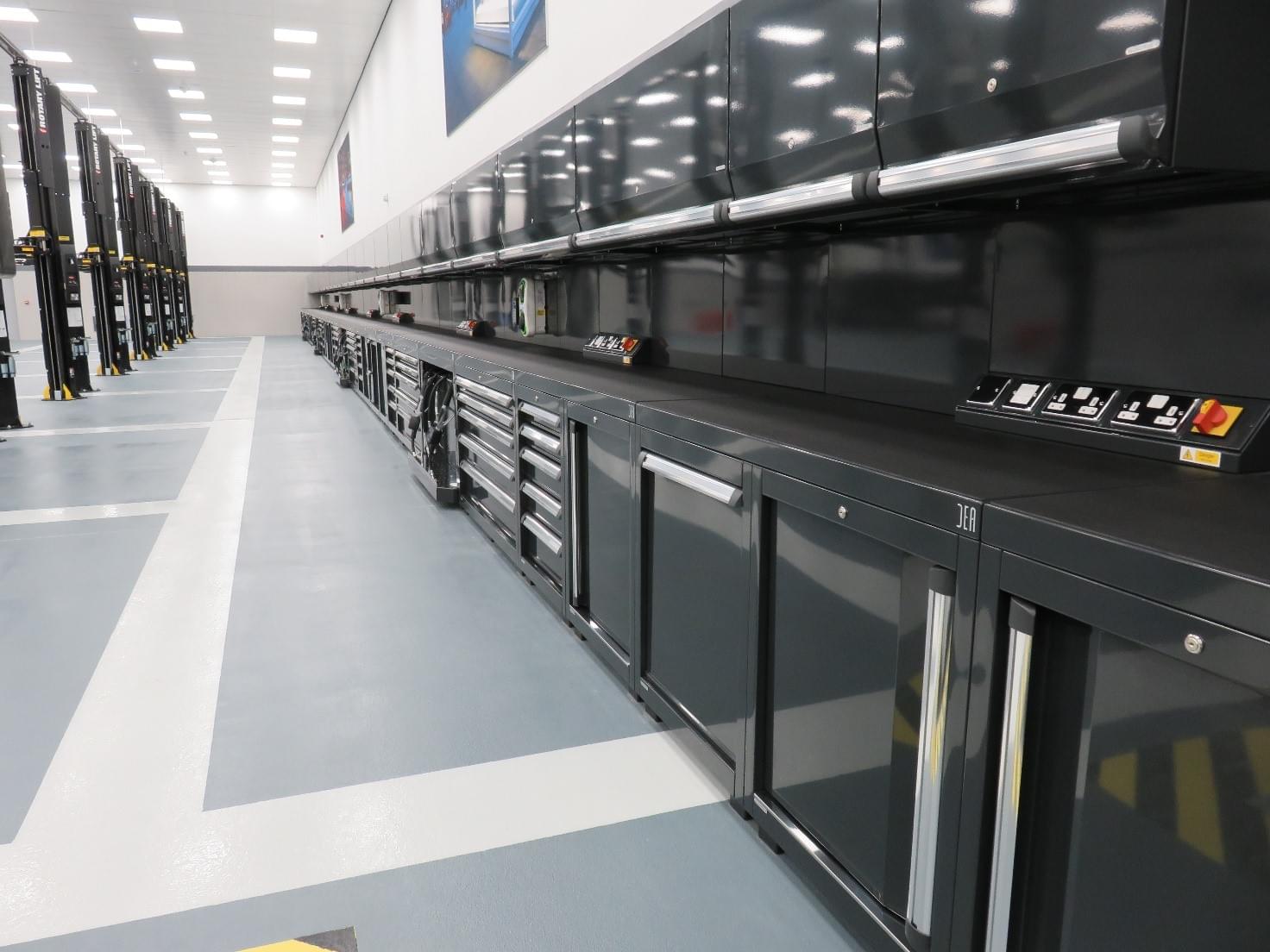 DEA solutions are not limited to the classic workstations positioned along the walls, but also include real "islands" in the centre of garages and workshops, with power outlets, fluid distribution pumps and sinks.