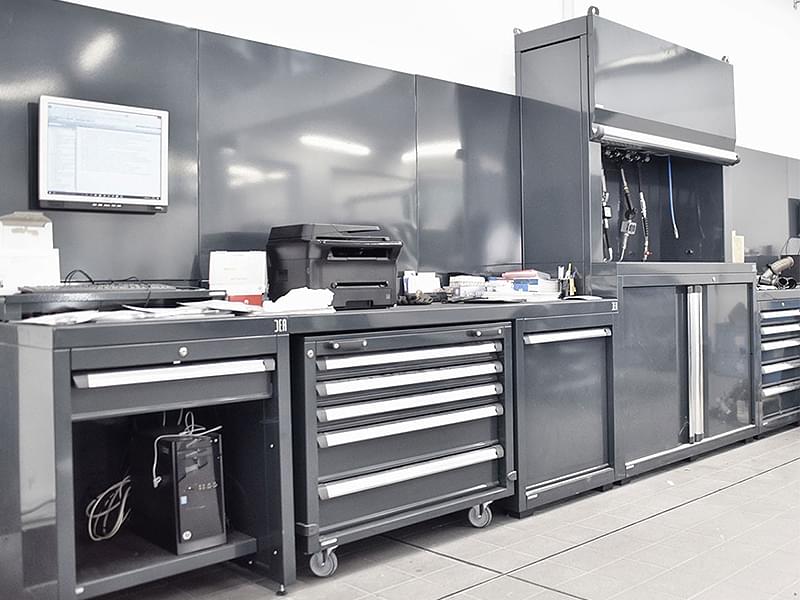 Il banco da officina da 1 modulo (larghezza 72 cm) è ideale per contenere piccoli pezzi di ricambio (filtri, ammortizzatori, fanali), utensili utilizzati raramente o materiale di consumo (carta, nastri adesivi, detergenti). Il modello con cassetto, invece, è perfetto come postazione laptop o PC. Zona accettazione e zona diagnostica. |