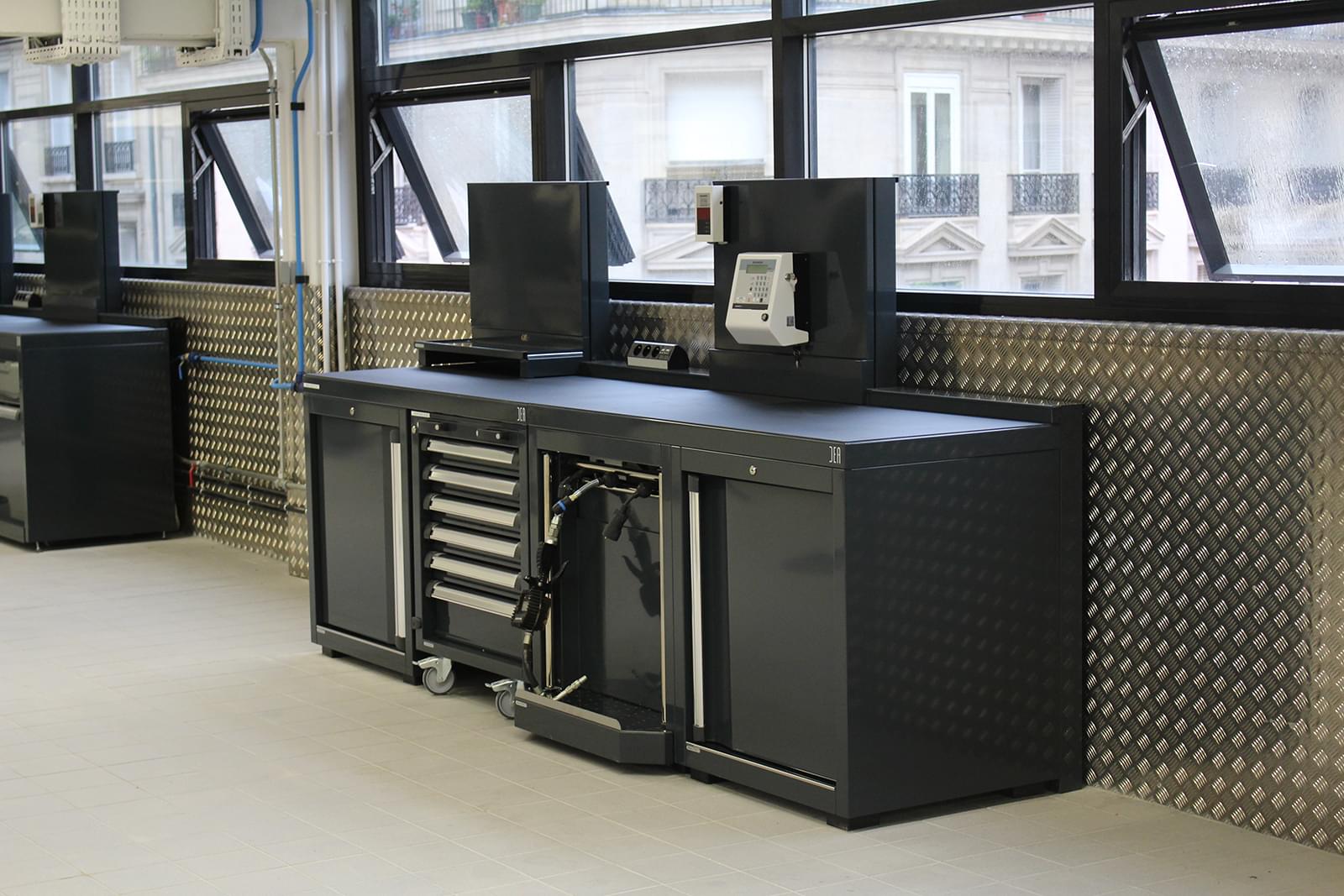 La peculiarità di questo progetto sta nell’ambiente nel quale è stato realizzato: essendo il sito dell’officina un palazzo storico con muri composti per la maggiore da vetrate, non vi era la possibilità di ancorare l’arredo tecnico alle pareti.