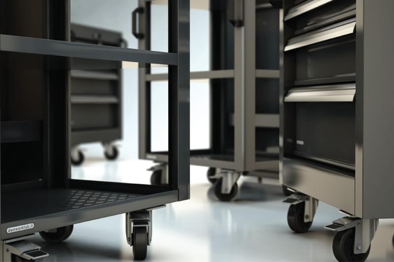 Un carrello portautensili che si rispetti deve anche essere dotato di ruote per seguirti ovunque ed essere sempre al tuo fianco. Dal banco di lavoro al magazzino, le ruote del carrello portautensili ti permettono di avere a portata di mano tutto ciò di cui hai bisogno per lavorare, risparmiandoti spostamenti inutili e velocizzando ogni operazione. I carrelli portautensili DEA sono dotati di 4 ruote pivottanti e due di queste sono anche dotate di freno per lavorare in sicurezza.
